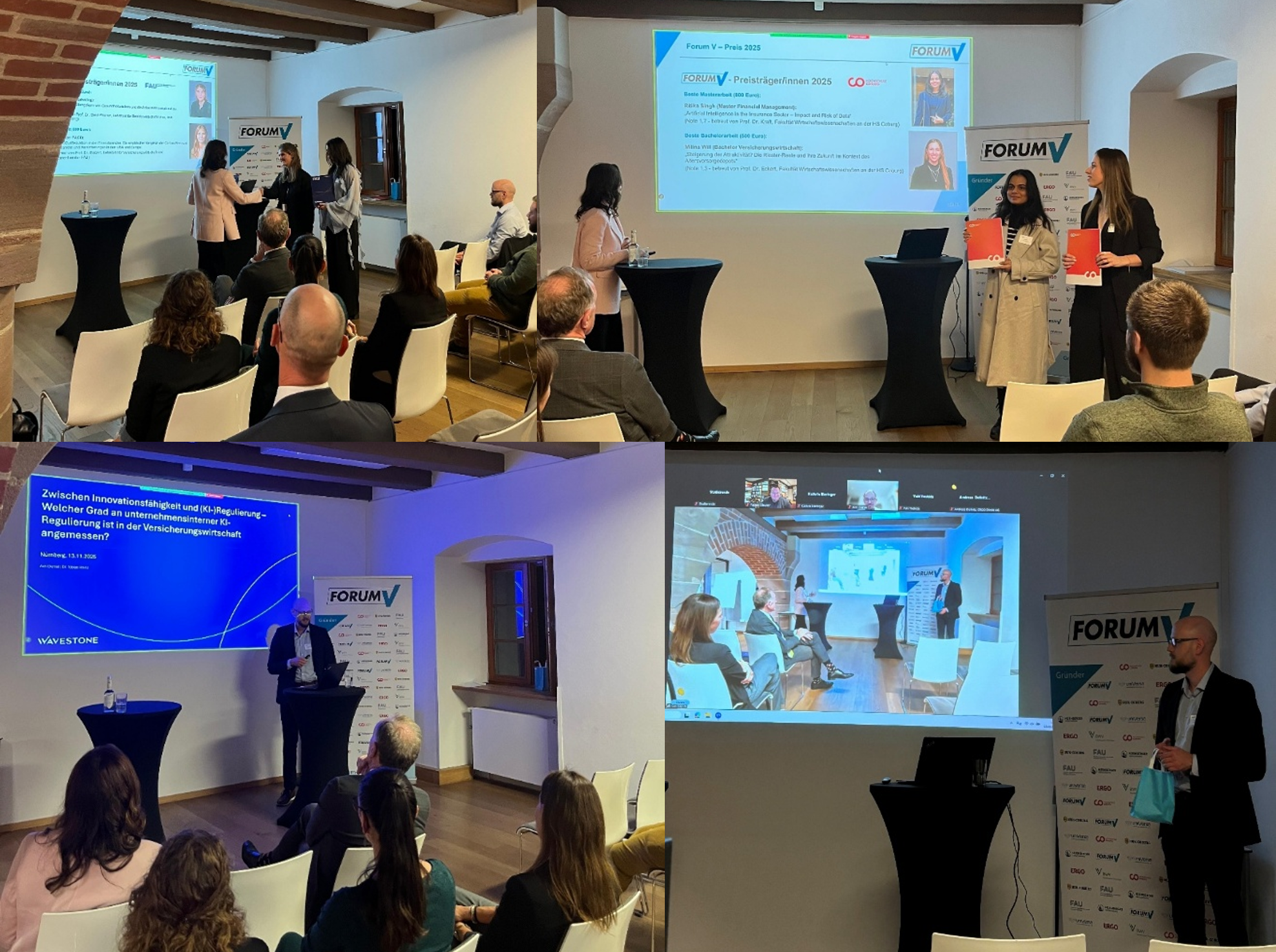 Ein weiteres Highlight der gestrigen Veranstaltung waren die Preisverleihungen der Forum V-Preise durch Frau Prof. Dr. Martina Steul-Fischer (Vorstandsvorsitzende von Forum V) und des BVK-Wissenschaftspreises durch Herrn Michael Heinz (Präsident des Bundesverband Deutscher Versicherungskaufleute e. V. (BVK)). Unsere Forum V-Preisträgerinnen und deren Abschlussarbeiten haben wir Ihnen über die letzten Wochen verteilt bereits vorgestellt. Freuen Sie sich über unseren LinkedIn-Beitrag diese Woche zu dem BVK-Preisträger und seiner wissenschaftlichen Arbeit. Herzlichen Dank an die Referenten für die sehr interessanten Vorträge im Rahmen der Forum V-Trends Veranstaltung sowie an die 48 vor Ort sowie 45 digital Teilnehmenden für die angeregte Diskussion und das nette Get-together im Anschluss an die Vorträge.