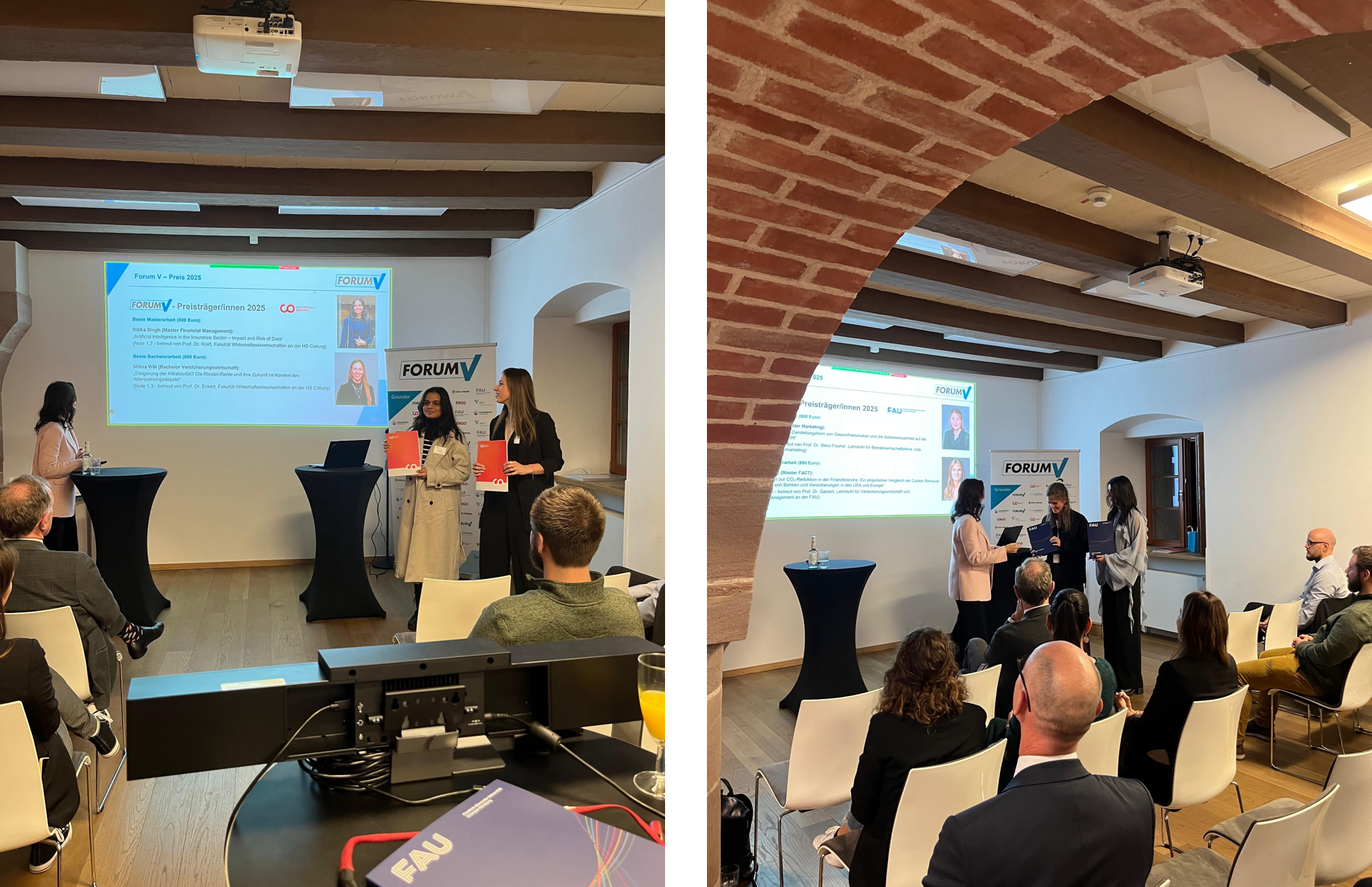 Zur Förderung des Nachwuchses im Versicherungsbereich verleiht Forum V jährlich vier Preise für die besten Abschlussarbeiten in Höhe von insgesamt 2.600 Euro und fördert damit die Lehre und den Nachwuchs im Versicherungsbereich. Ausgezeichnet werden die beste Bachelorarbeit und die beste Master-/Diplomarbeit im Bereich Versicherungswissenschaft an der Universität Erlangen-Nürnberg und der Hochschule Coburg.